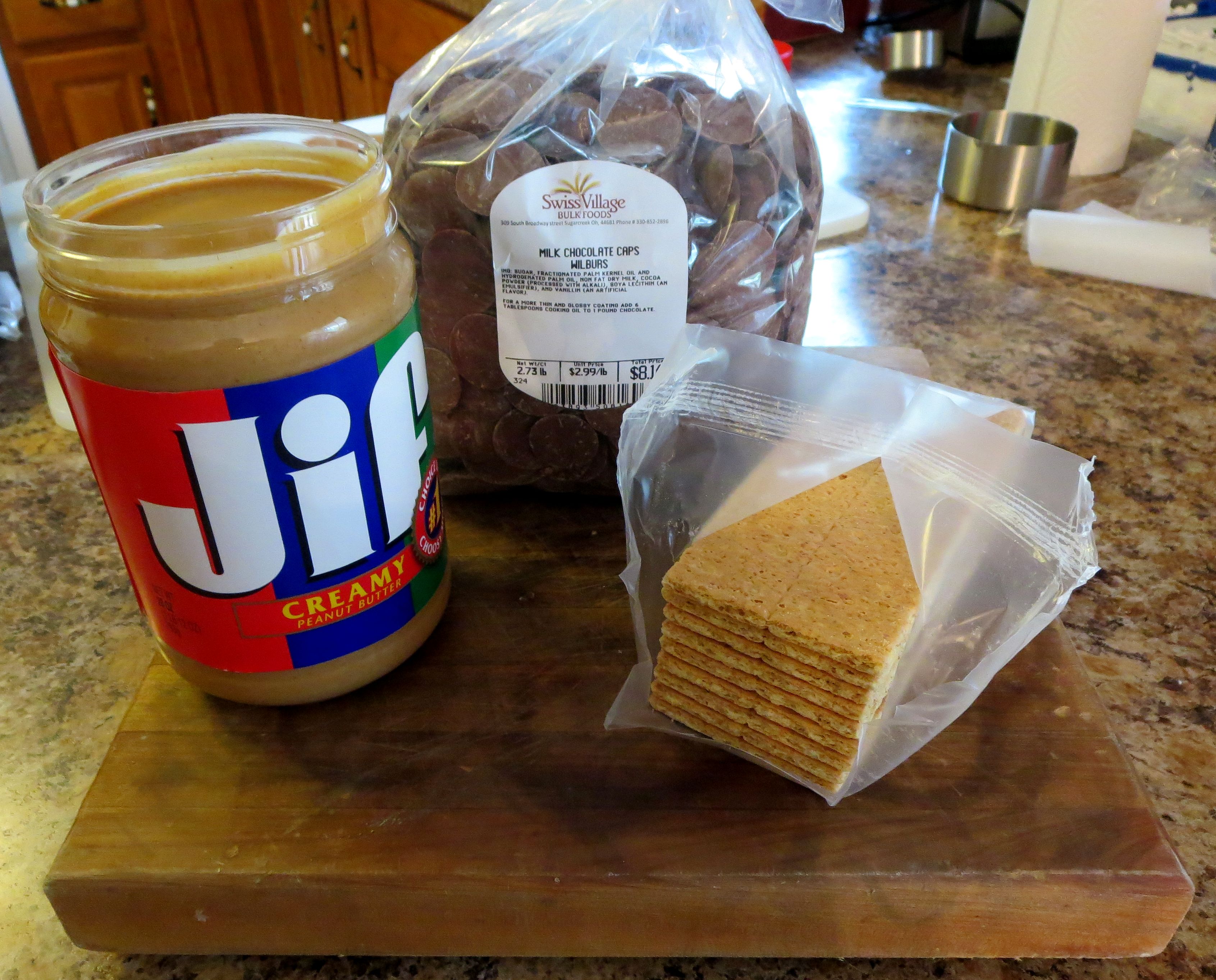 Gather your peanut butter, graham crackers and melting chocolate. We are lucky enough to live near an Amish country and the chocolate in this photo is just the best! If you can find something similar sold in bulk like this, please use it over chocolate chips! Yum!