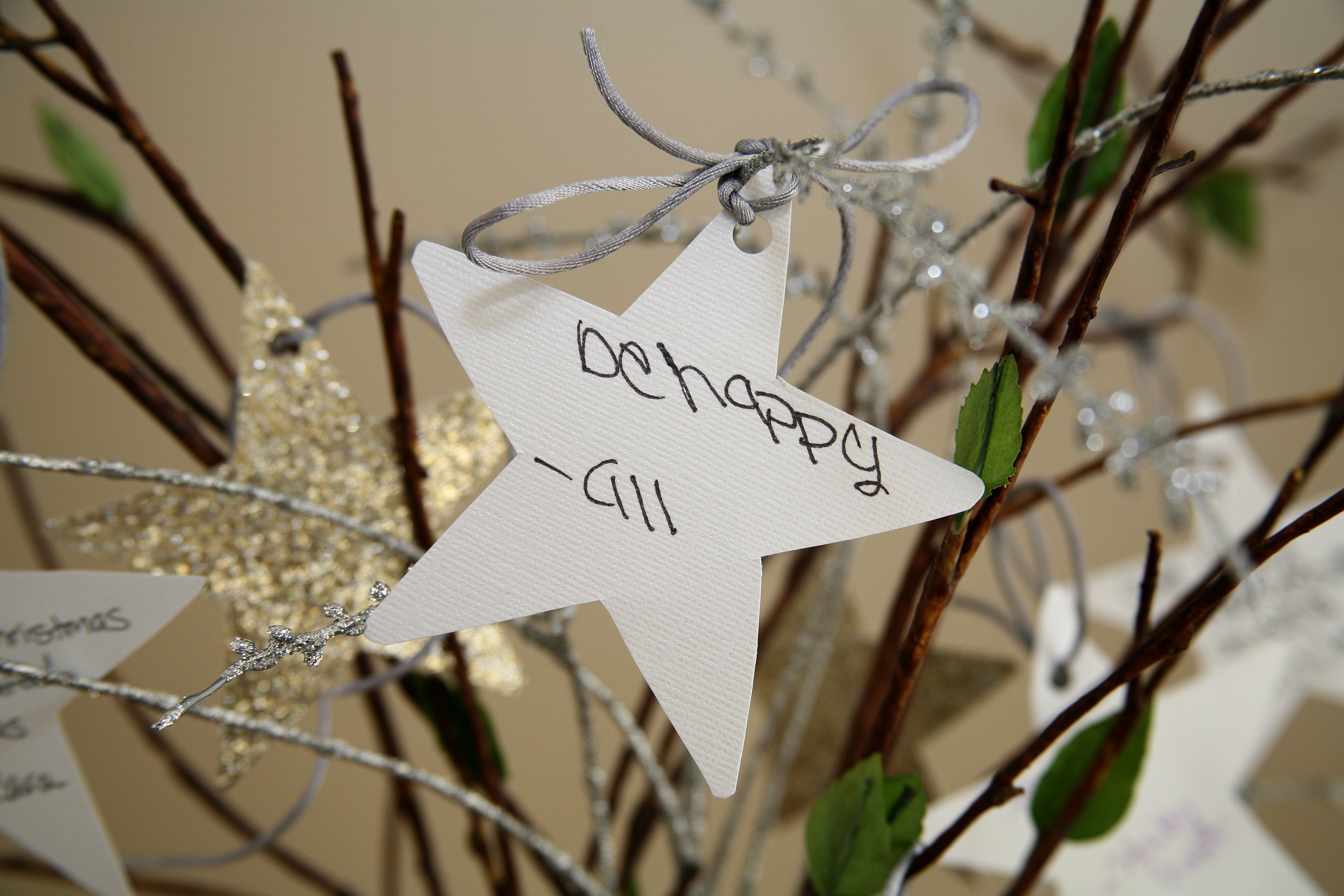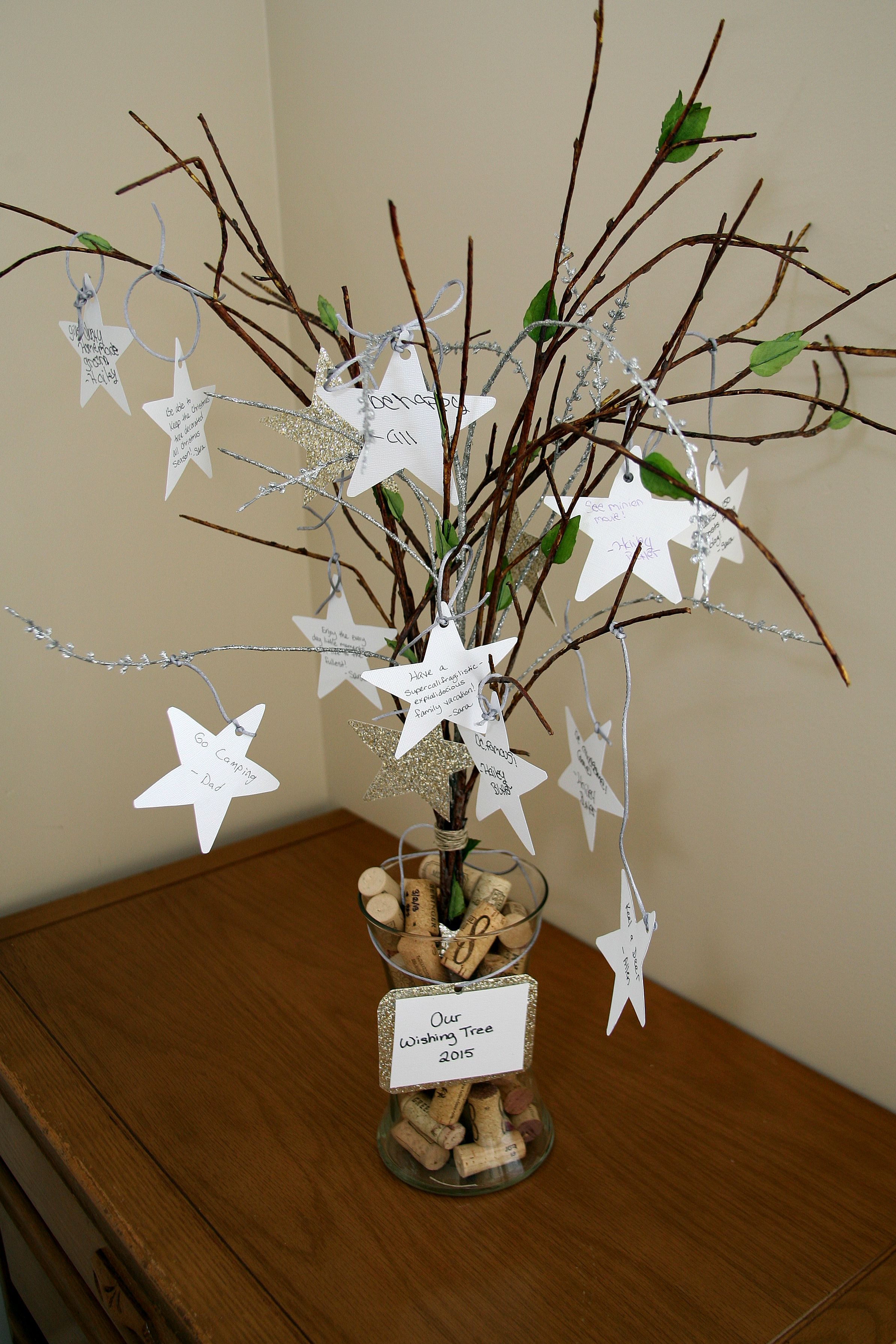 We chose branches we liked best at the store for the tree. I’ve also seen this made with branches from your own back yard spray painted. For the stars we just chose paper that would go well with the tree and bought two stars ($1 each) to trace and cut out. After writing on each star, we hole punched it and looped the silver rope through it to hang/tie on a branch! Some of the wishes were funny and some were serious! I really like the one Hailey wrote for all of us that just said ‘Be Happy’. So simple and so important for a wonderful year!