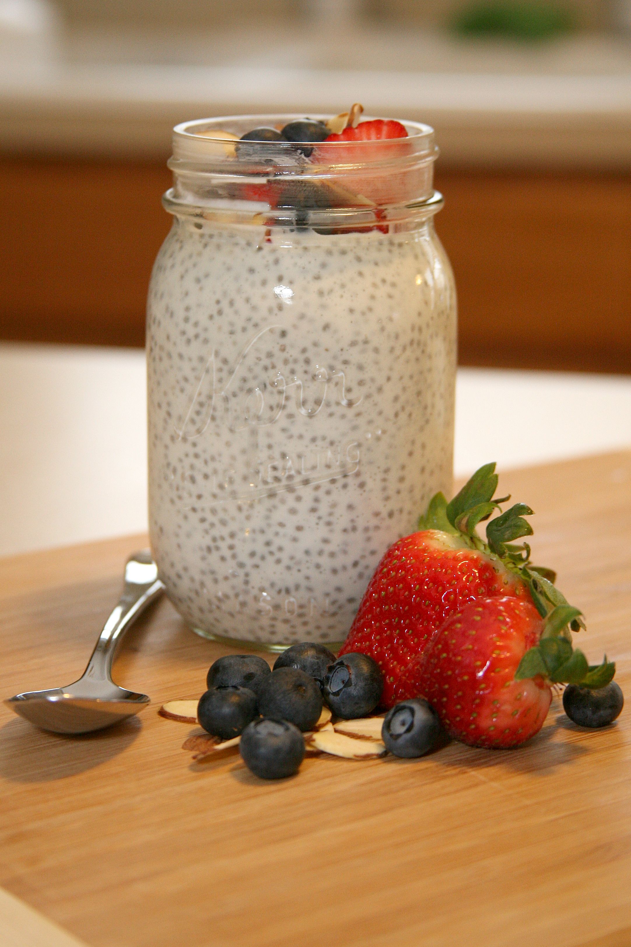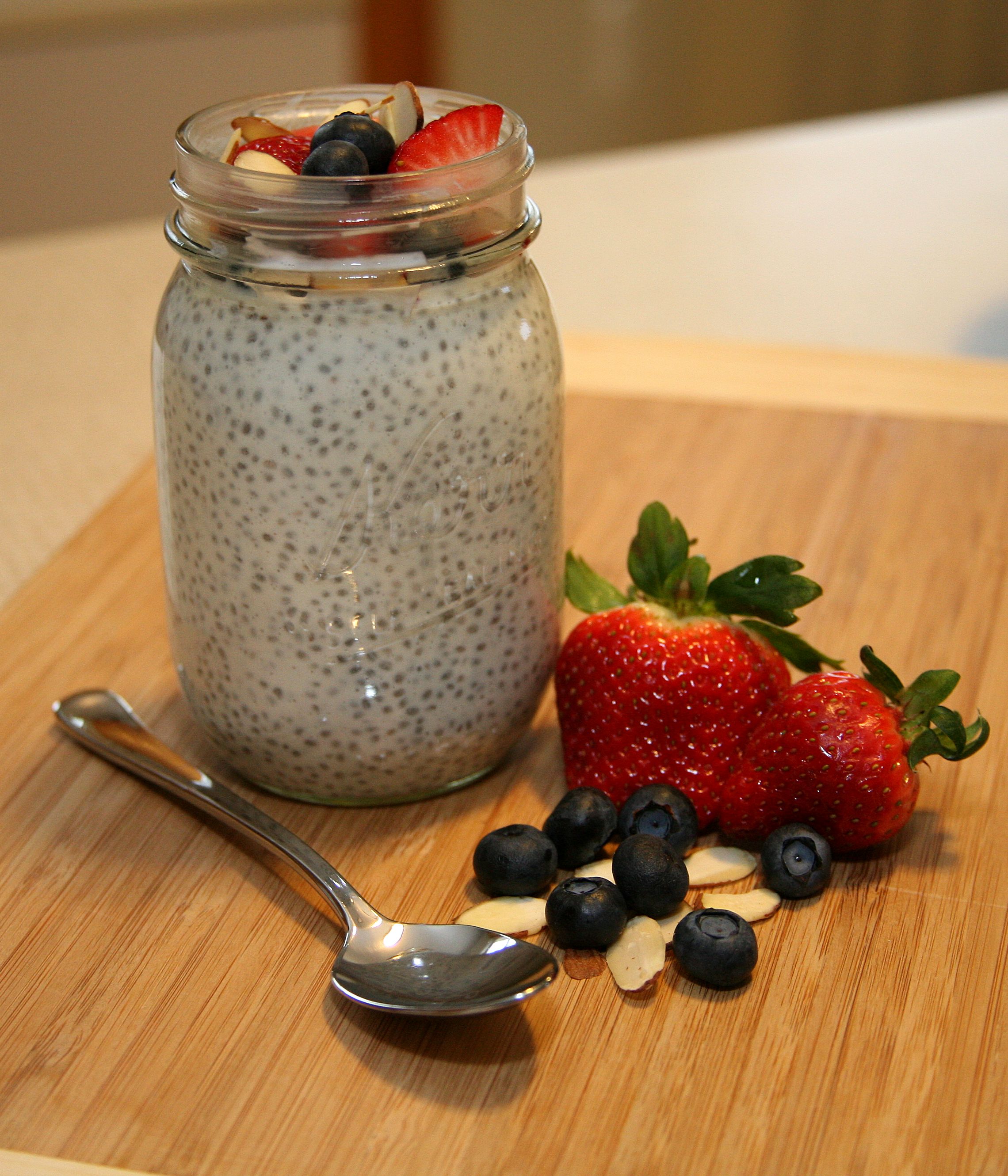 I’m always looking for new healthy recipes and came across this one recently on Pinterest. I’ve never tried eating or cooking with chia seeds and didn’t realize just how much nutrition they pack! Do you have any idea how healthy these little seeds are for you? It’s worth a Google search to read the details on the antioxidants, fiber, protein and omega 3 fatty acids they contain and how they promote good health. This pudding recipe was my first attempt at making something with chia seeds and I’m happy to say it was successful! The pudding is incredibly easy to make and has a great taste, especially when topped with berries and almonds! My husband approved as well and I plan on making this again next time we have my step daughter with hopes she’ll enjoy it too!