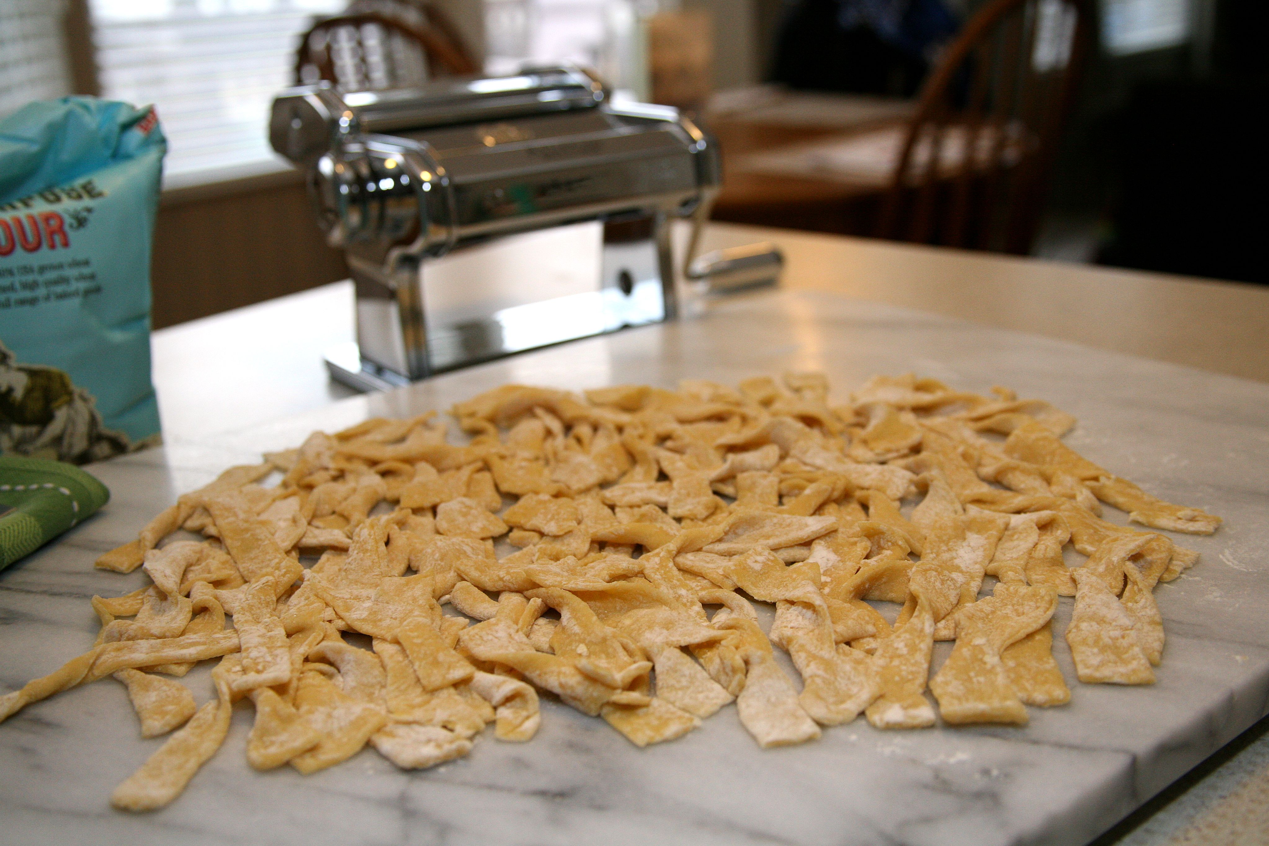 - Divide and roll very thin to put through your pasta maker as directed. If you are not using a pasta maker, simply use a proper cutting tool to cut noodles to desired length.
