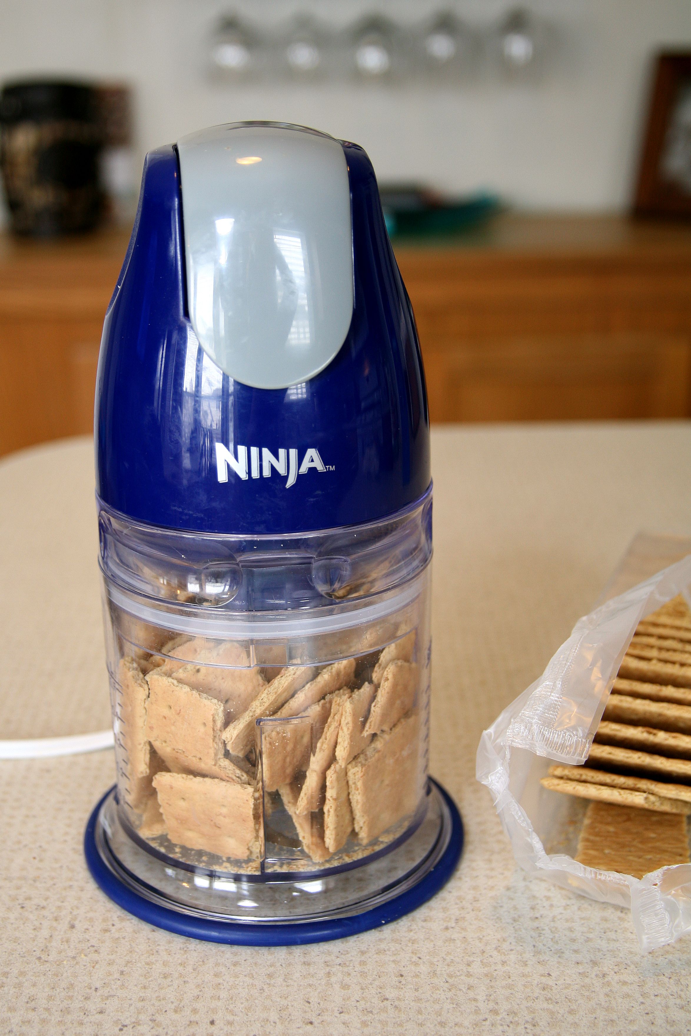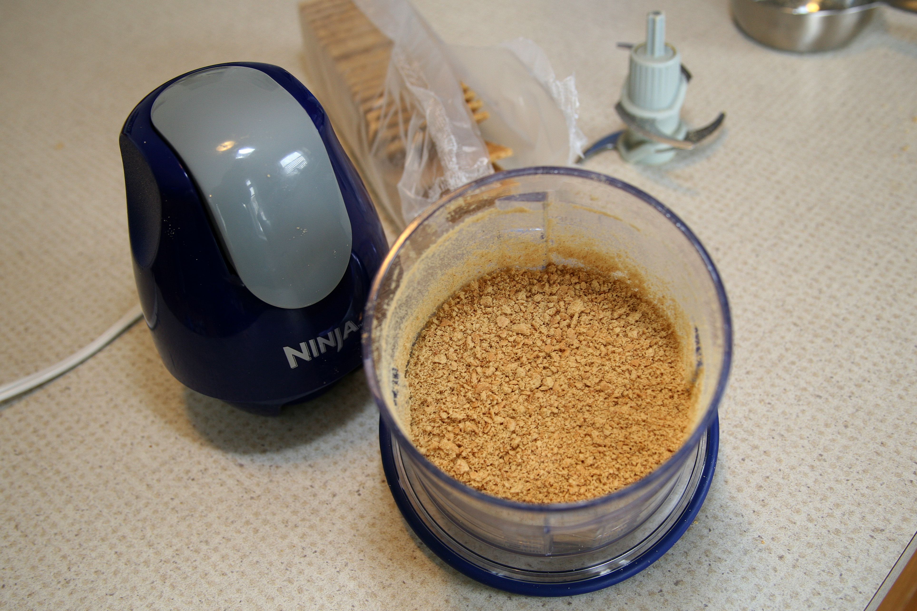 I don’t have photos for all the steps (the process is quite simple), but I do have a few quick tips to share for easy baking! The recipe calls for crushed graham crackers. I used to do this the way many of you might, adding the crackers to a Ziploc bag and crushing them with a rolling pin or the flat side of a meat tenderizer. Well, my family has a cheesy potato recipe we all love and it includes crushed cornflakes…my Dad recently told me about using the Ninja food processor to quickly and effortlessly crush the cornflakes. Of course! Why had this not crossed my mind before? It works brilliantly so I decided to use it again today for the graham crackers. If you still don’t own a Ninja food processor, I really suggest you buy one soon! In the first photo you’ll see the graham crackers broken up slightly and added to the processor.