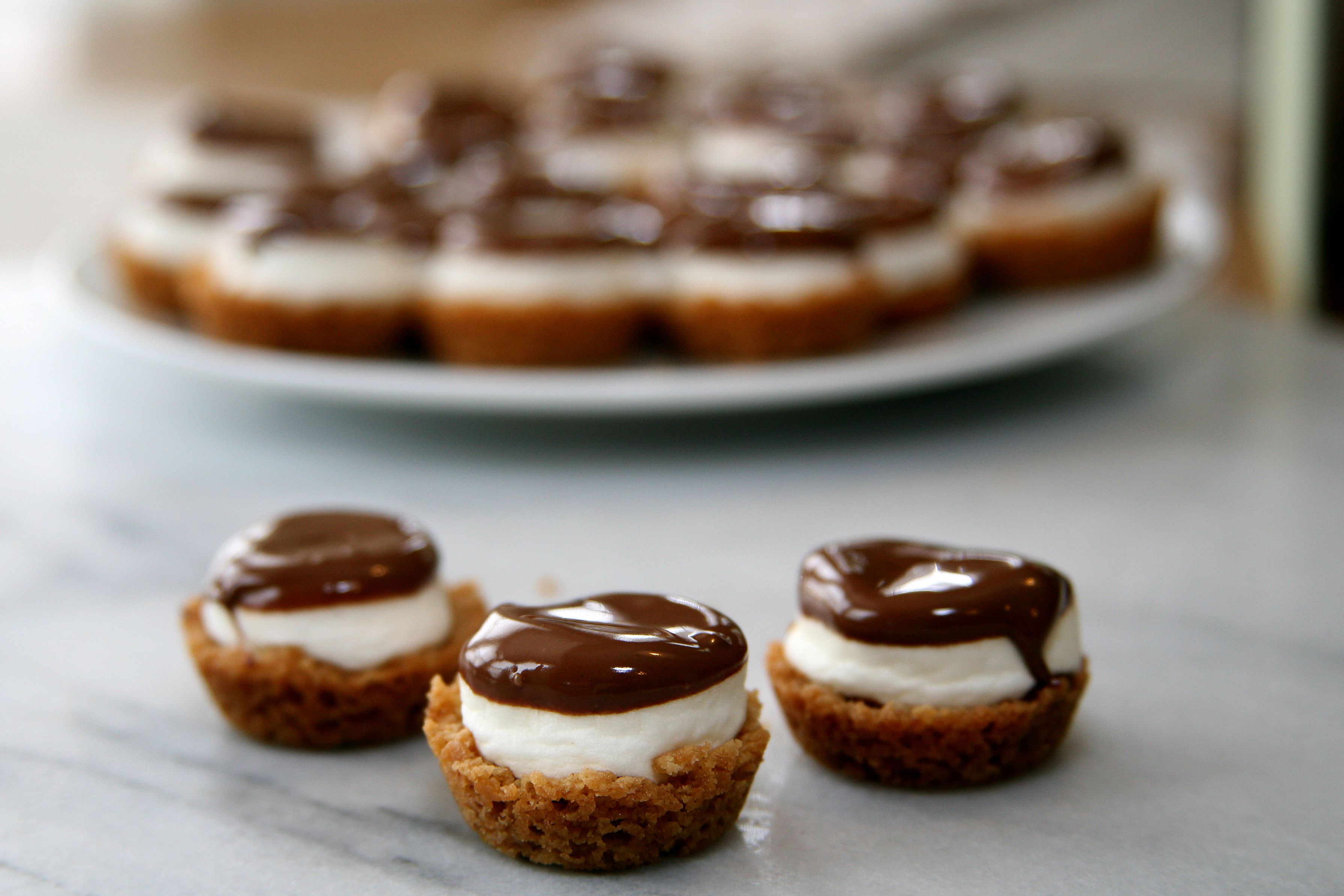 - Using the graham cracker crust made in step 4, scoop a small amount into the cups of a mini cupcake pan. Press crumbs to form shallow cups. Bake 4-5 minutes or until edges are bubbling.