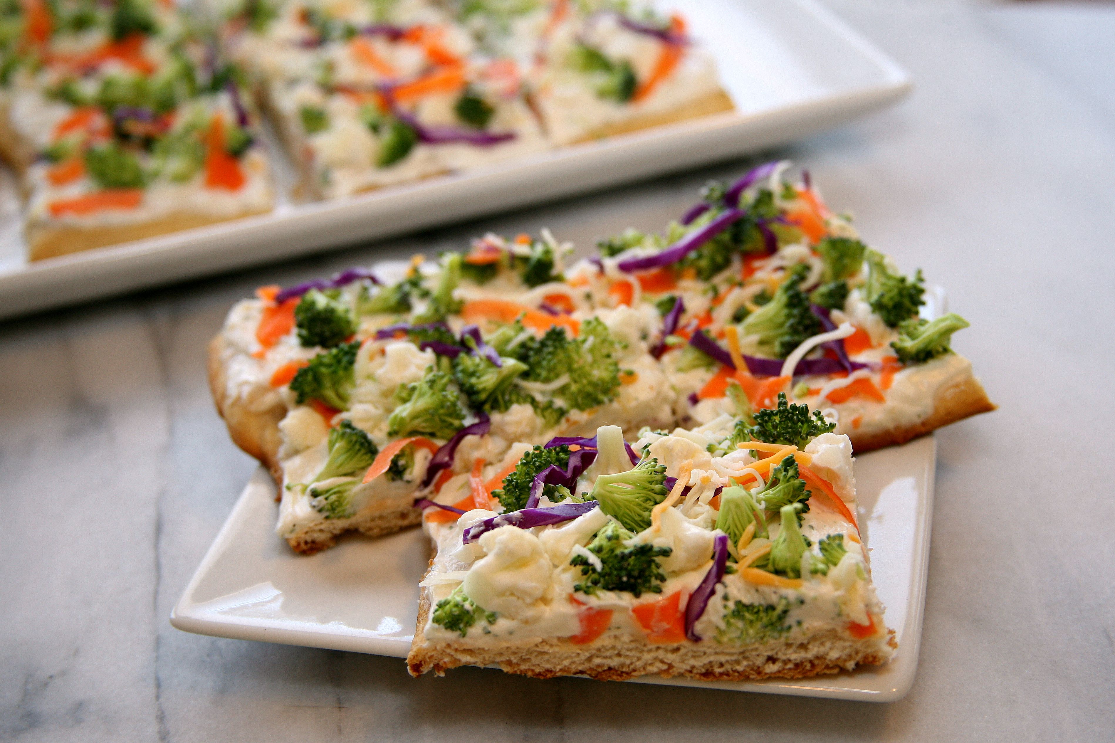 I have found this veggie pizza to be quite the ‘crowd pleaser’ at parties and within our home! I’ve made it several times and much like the s’more cups, I never have leftovers to bring home or put back in the fridge. Bonus, even my picky step daughter likes this one…as long as there’s no cauliflower on her pieces that is! The other great thing about this veggie pizza is how versatile it can be; you can customize it to your liking based on your favorite vegetables! Normally, I only add broccoli, cauliflower and carrot to mine; however, I bought some red cabbage at the store this week and decided to add a little of that too for some nice color and added taste. The recipe at the end of this post makes one large or two small pizzas so you could even do a couple variations and make each one different. An idea I just thought of actually and will use at the next party we host! 🙂