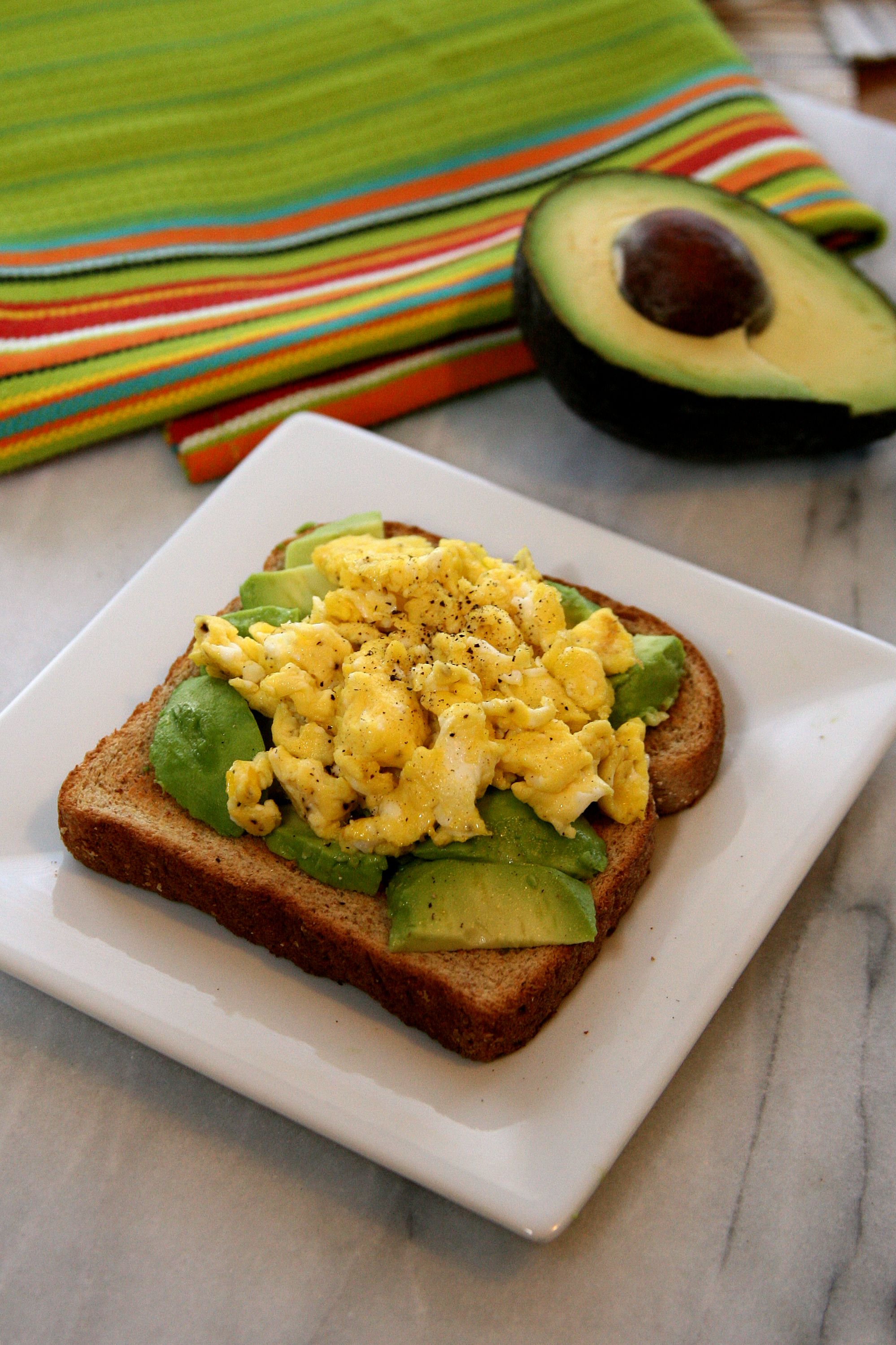 - Remove bread from the toaster, top with avocado (mashing slightly if needed) and add scrambled eggs over avocado. Season with pepper to taste.