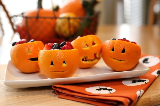 - Using a small knife, carefully carve out jack o’ lantern faces on each orange.
