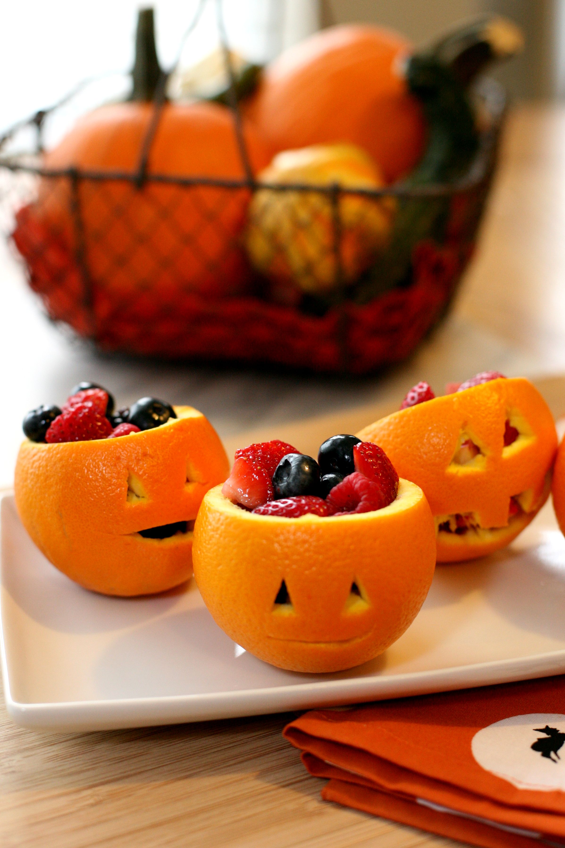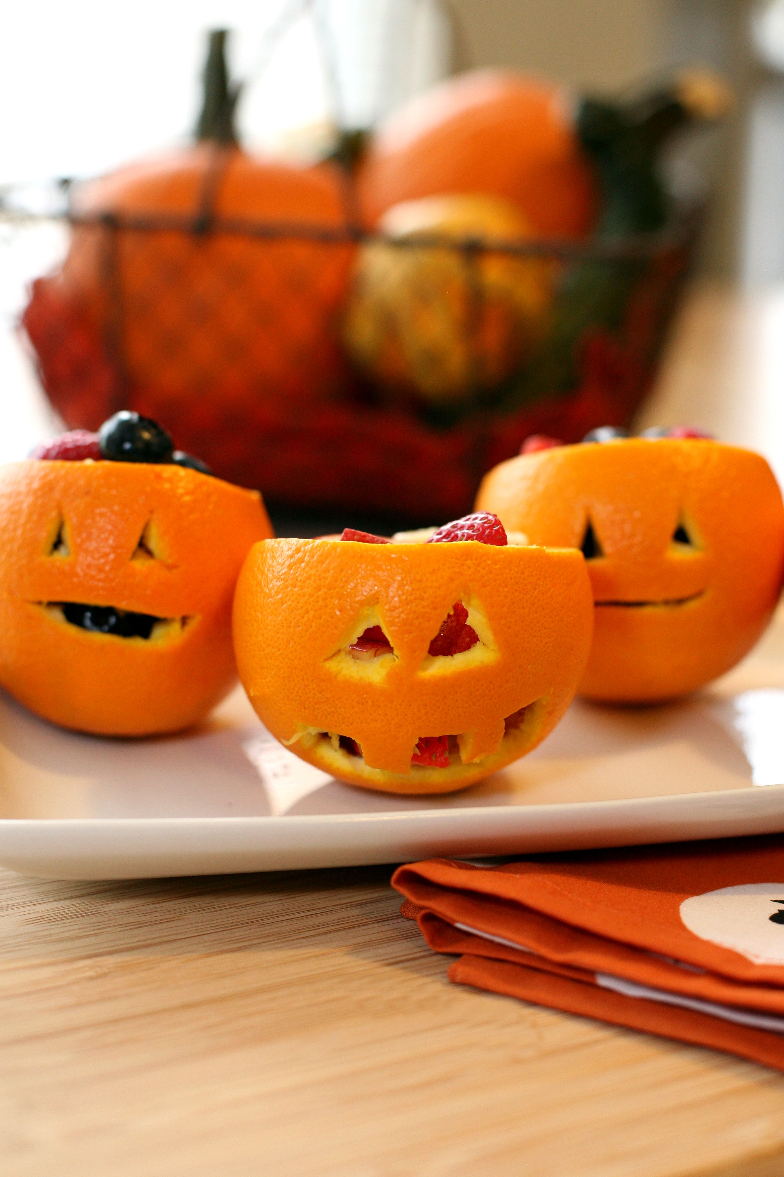 Happy Halloween, friends! With the amount of Trick or Treat candy Hailey brought with her this weekend, I wanted at least one treat we made to be healthy! These oranges turned jack o’ lanterns were the perfect festive snack and proof that enjoying the holidays doesn’t always mean over indulging! Most of our ‘jack o’ lanterns’ were filled with mixed berries, except for Hailey’s as she requested strawberries, bananas and apples. She did try a blueberry and said it was good, but apparently not good enough to be added to her hollowed orange. A for effort? I think so 🙂