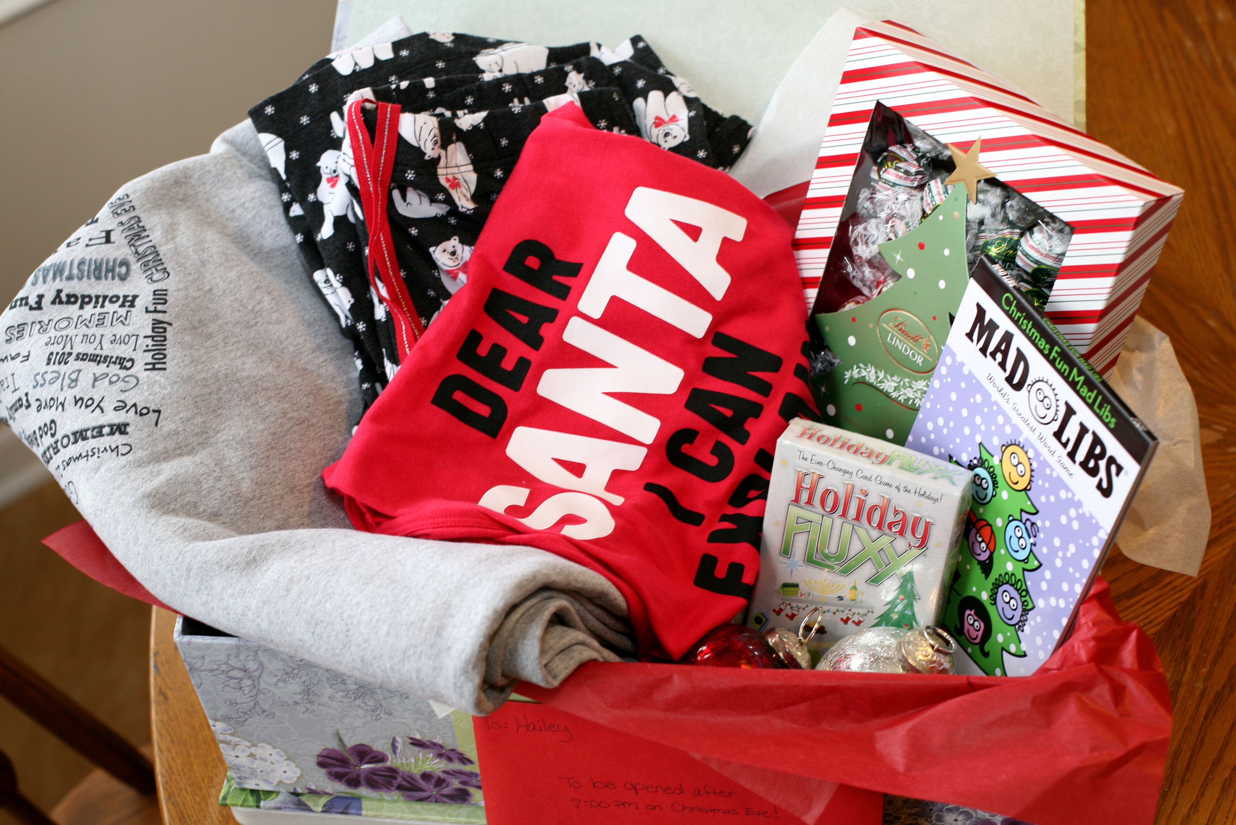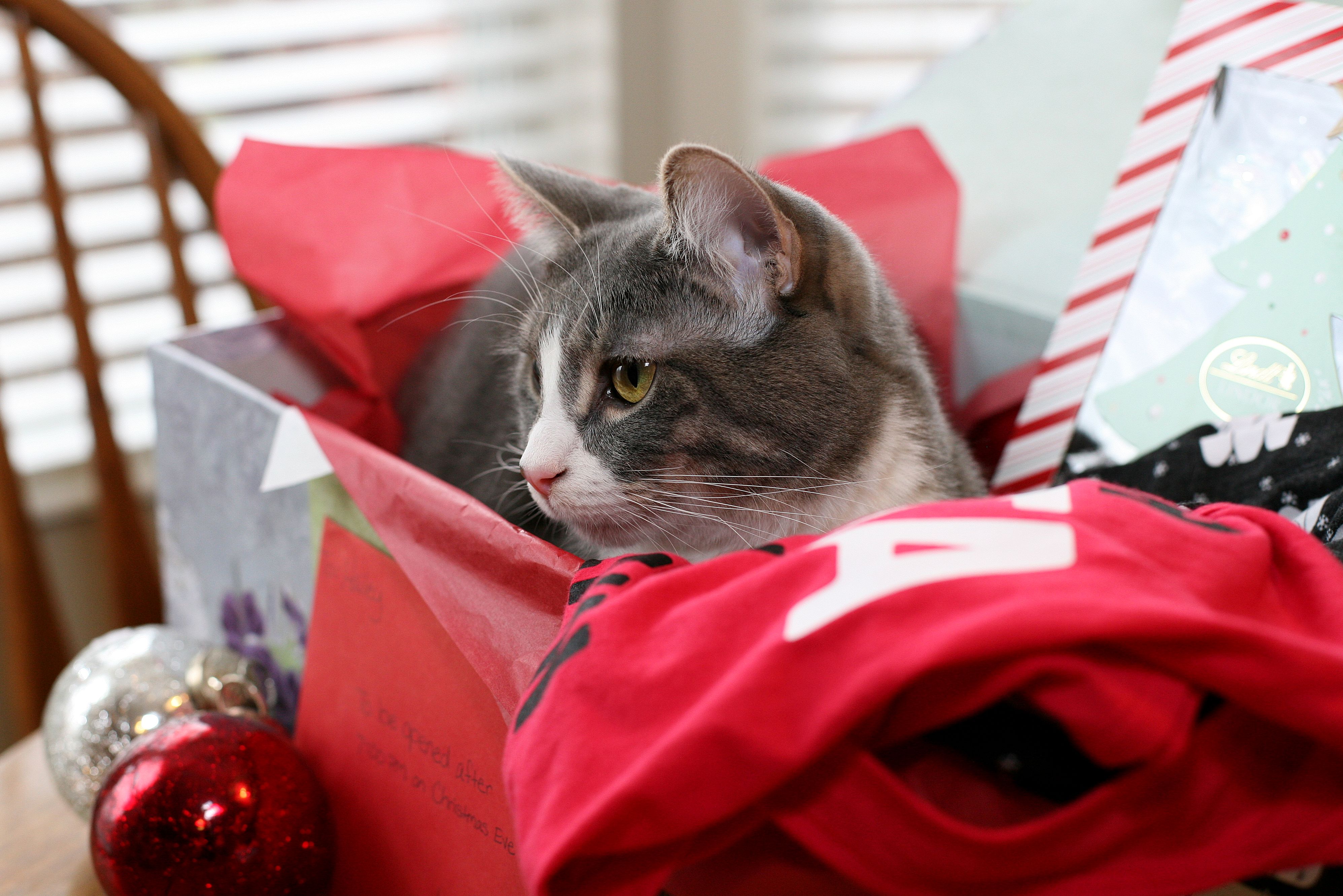 Amazon is a great place to browse for such items and I love being able to read reviews. In fact, sometimes I’m one of those people who spends far too much time reading reviews and weighing the pros and cons! Don’t ask me to plan a vacation for you if it needs to be booked asap! I decided (fairly quickly might I add) on two gifts to contribute to her Christmas Eve box: Christmas Madlibs and Holiday Fluxx. I’ll be sure to report back on the second game, because it’s a new one to us! Has anyone ever played the Fluxx card game? I read the holiday version is simpler and the descriptions I found online sound entertaining! Speaking of entertaining, our cat Mosby was a big help in putting this gift together š