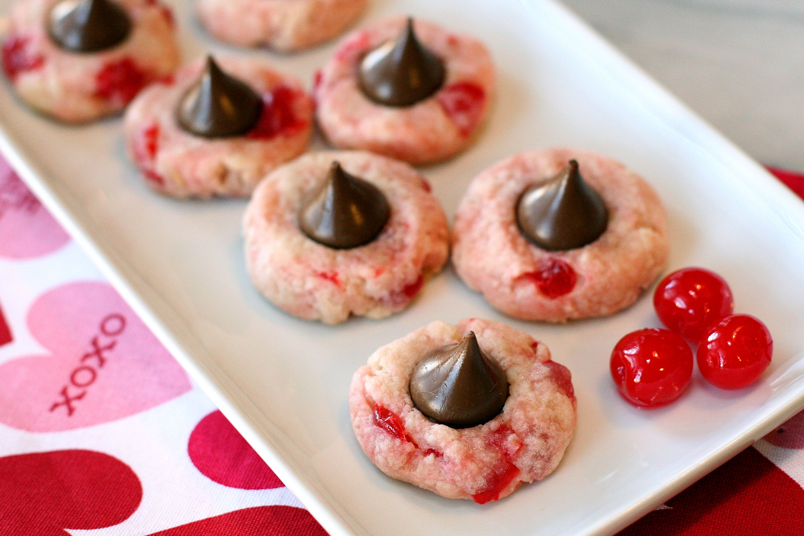 I figured this would be the perfect cookie to bake, because I’m actually not a big fan of maraschino cherries and therefore wouldn’t eat them…except I’ve already had two. Oops. So if I liked them, you know the true maraschino cherry lover in the family would thoroughly enjoy them! And she did…Hailey said they were “realllllly good” as she proceeded to eat three cookies that afternoon 🙂 If you want to make the dough a deeper red, you can add red food coloring to the recipe. I chose not to so the color comes just from the juice in the jar of cherries. I think they turned out perfectly for Valentine’s Day with a nice blush/pink color that pairs well with the red cherries. I will tell you the original recipe I followed felt like it had too much flour and not enough juice to the point that I added a tiny bit of water to keep the dough moist. I’ll do my best to modify the recipe below and keep you from having to do the same, but please keep that in mind and adjust as needed while baking!