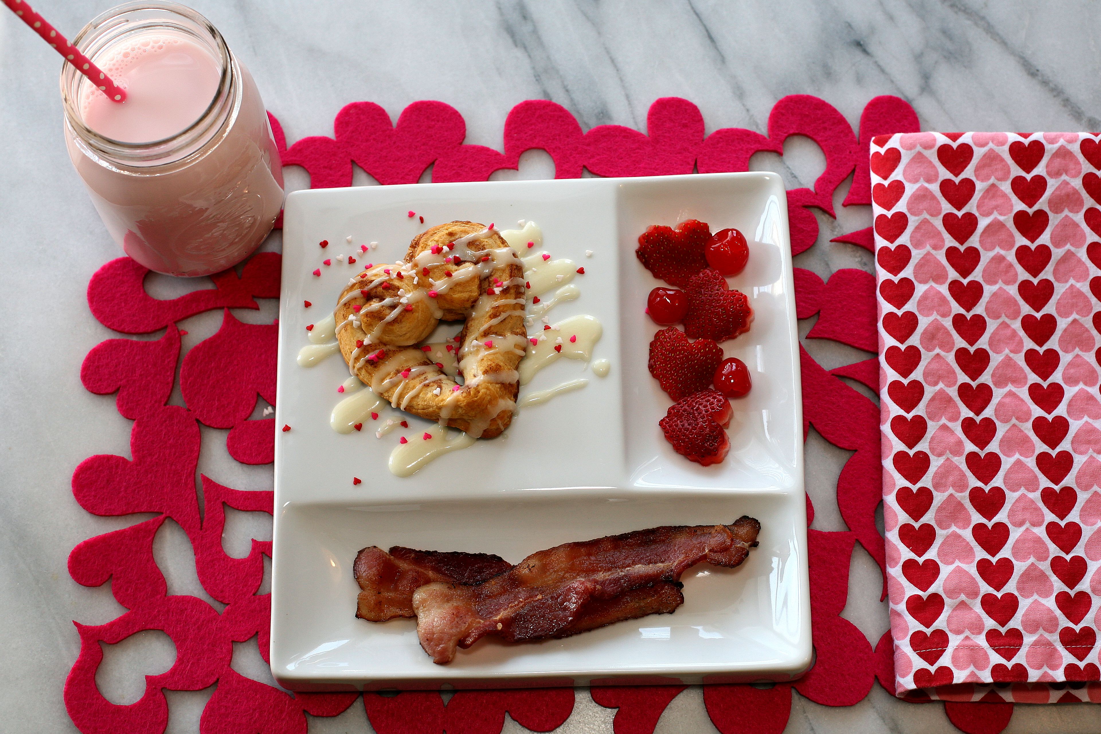 Brunch consisted of heart shaped cinnamon rolls, bacon, heart shaped strawberries, cherries and pink (strawberry) milk! A friend of mine shared the idea for the cinnamon rolls and they turned out perfectly! They were much easier to shape than I anticipated and couldn’t have been cuter on the plate! As Hailey says, they were “almost too cute to eat”, key word being ‘almost’ luckily! I used Pillsbury cinnamon rolls to keep this extra easy. If you want to try them simply unwind each roll into a long piece of dough keeping the center coiled and then coil the unrolled end to match. To finish, pull the middle strip down to make a point and pinch it to form a heart shape. Once they are baked (following baking instructions on can) drizzle with icing and top with sprinkles.