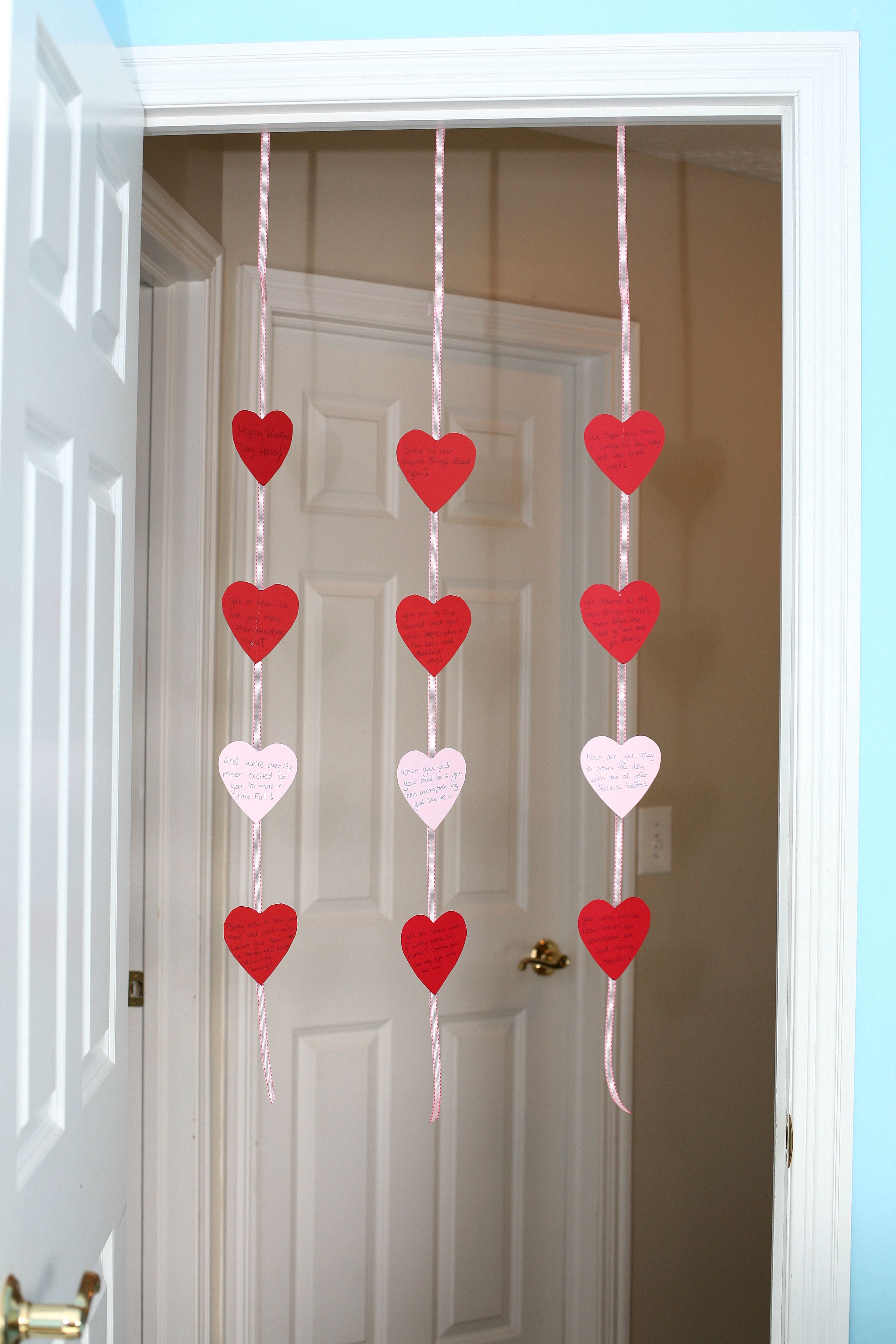 post! This year was a bit last minute, but that goes to show you how quickly you can put together this…door decoration? I don’t have a good name for it yet. Suggestions are welcome! Lucky for me, Hailey likes to sleep in these days allotting me enough time to wrap her gifts and create this surprise the morning of Valentine’s Day. All you need for this cute door decoration is ribbon, construction paper and a hot glue gun with glue! Reading left to right and top to bottom, I wrote out sentences wishing her a happy Valentine’s day and eventually leading her to come down to the kitchen to start her day with a breakfast, or more realistically, brunch of favorite foods!