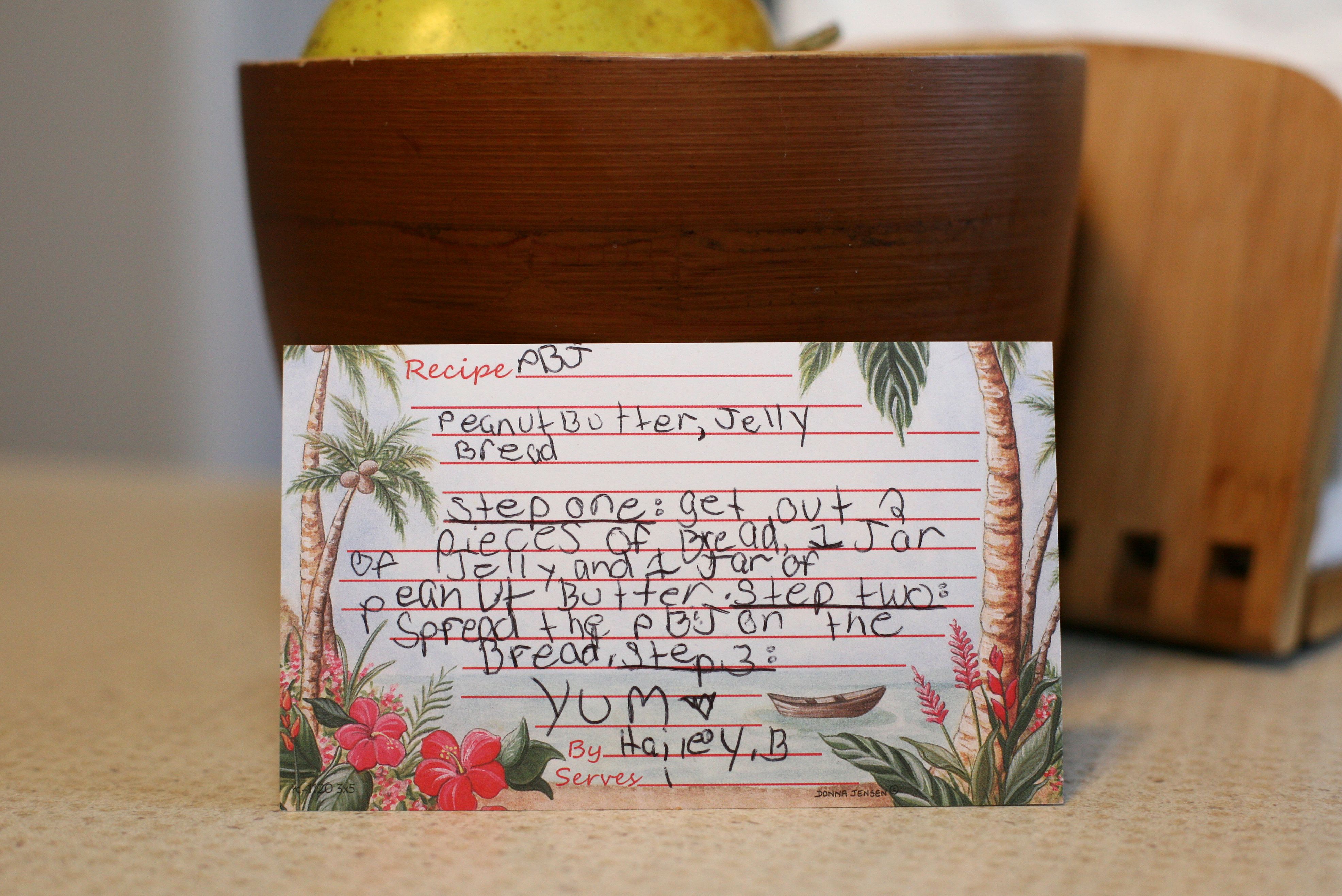Now that the gift is ready to go my final task is writing a recipe for the future Mr. & Mrs. Each guest was sent a recipe card with the invitation and asked to bring it to the shower with a recipe written on it. We did the same for my bridal shower and I really enjoyed reading through all of them afterwards. I received some fantastic recipes that are still referenced in our kitchen today, but my favorite one was from my sweet step daughter who provided me with the steps to make a classic PB&J! It was the best and this is certainly one of my most cherished recipes!