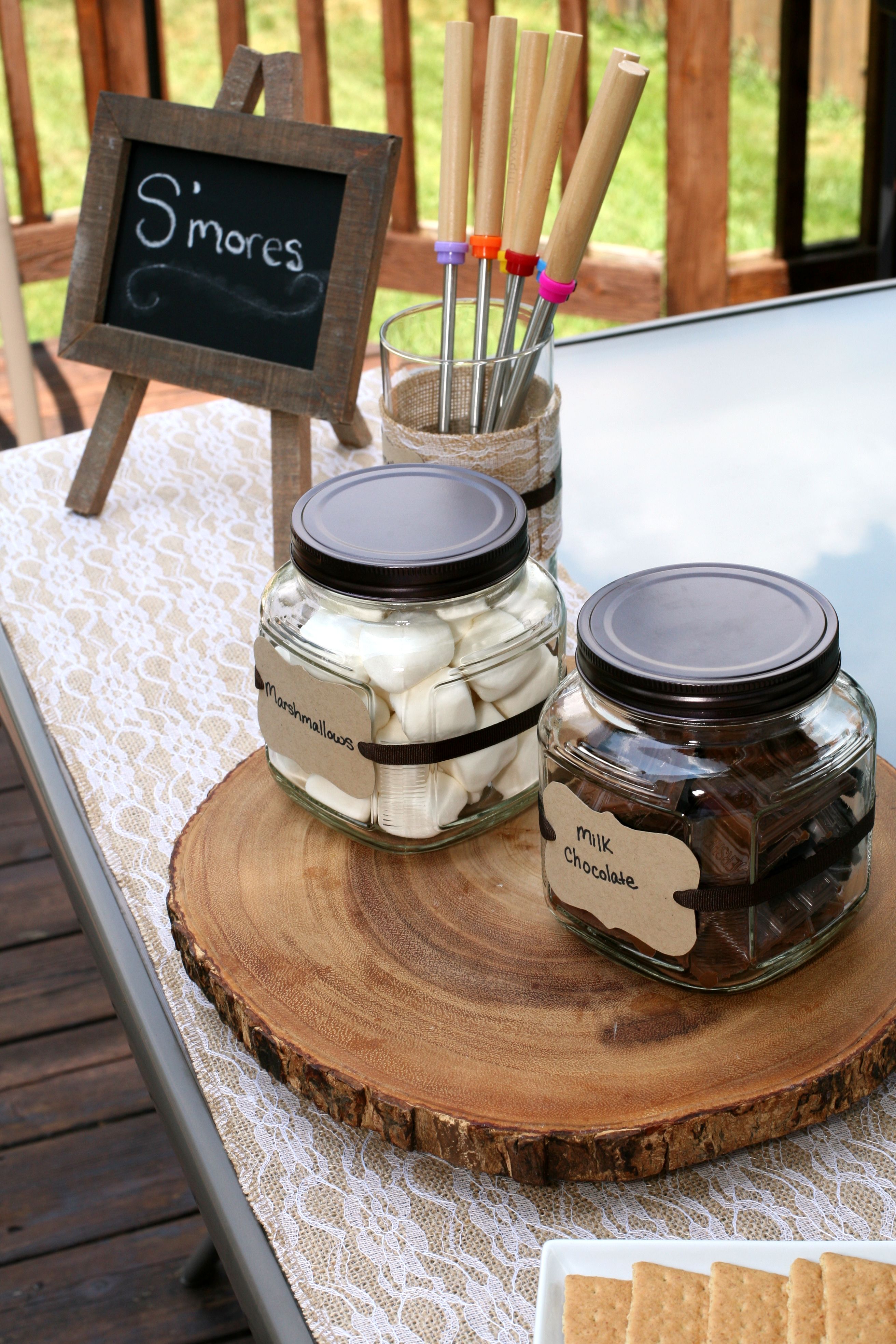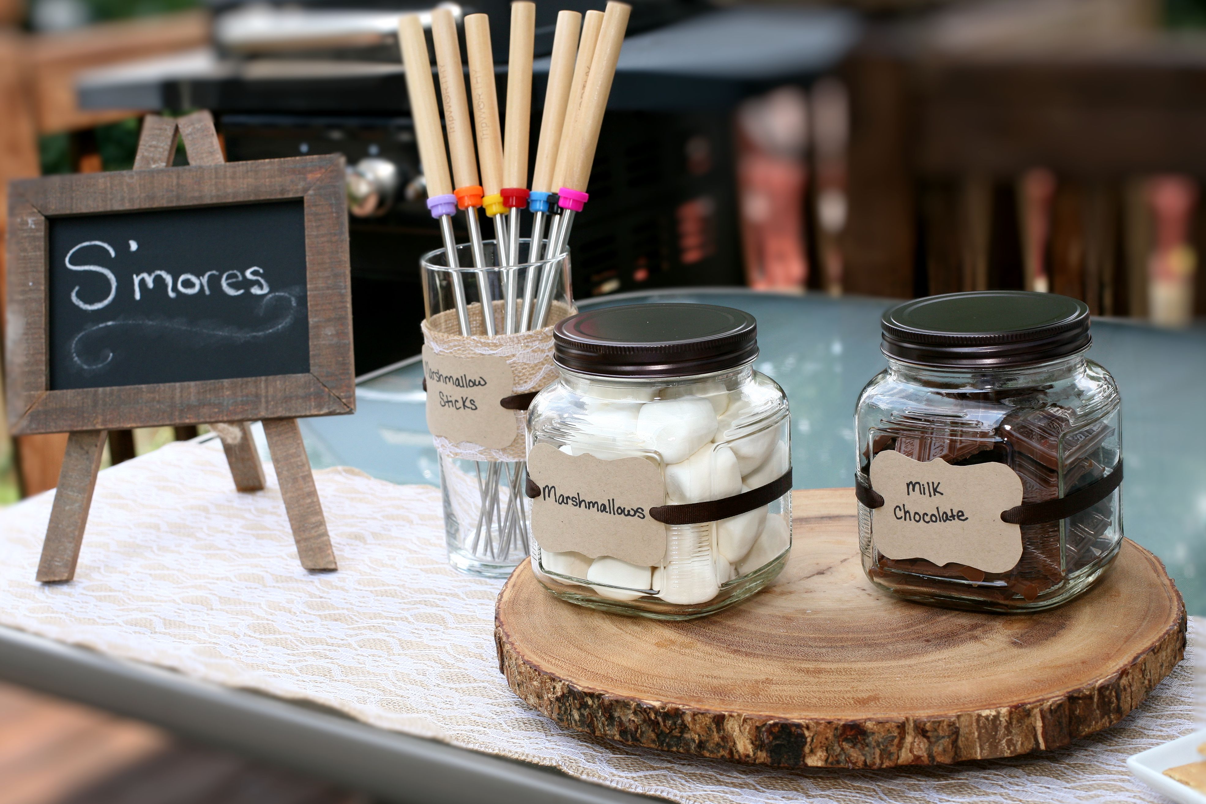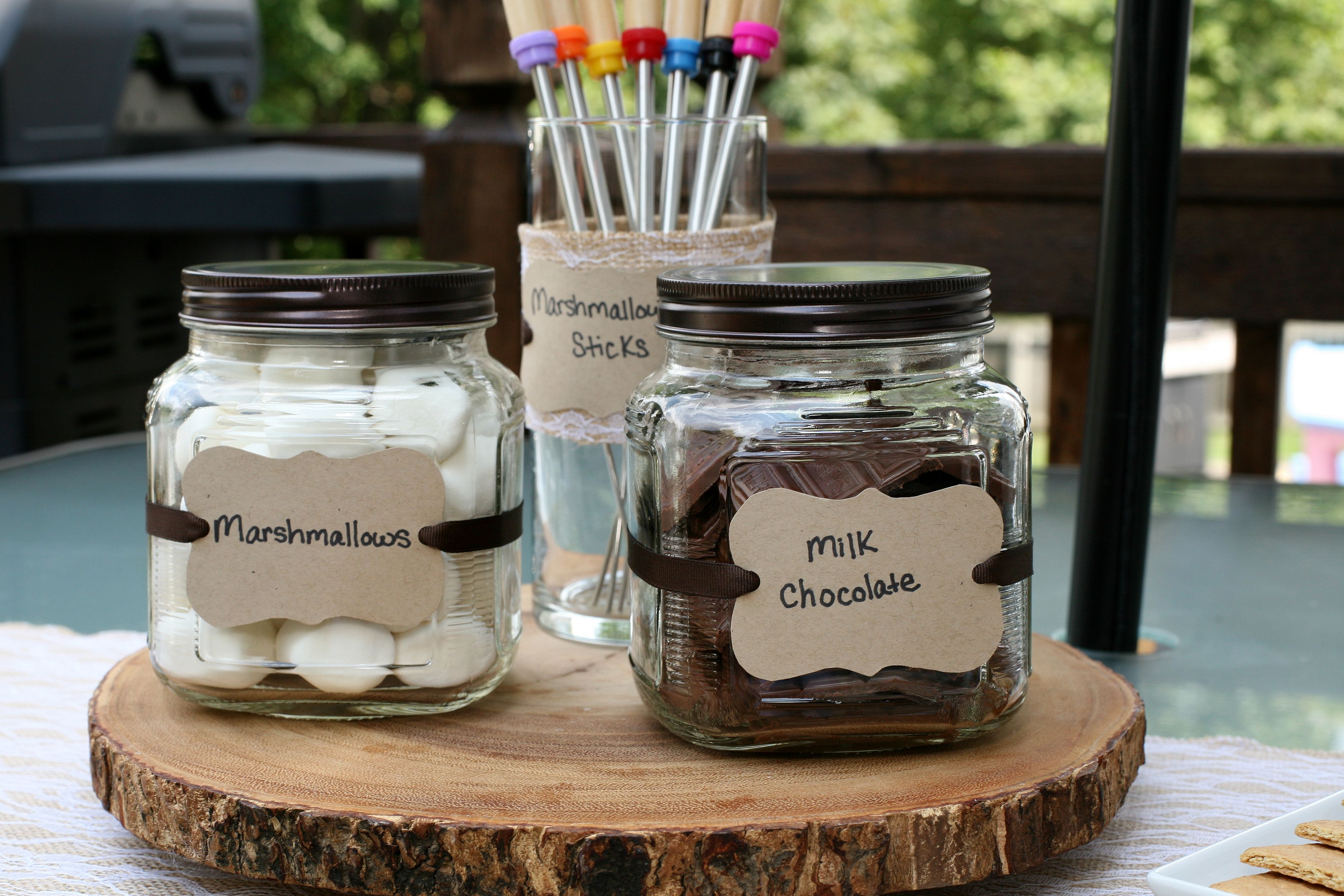 I’ve always wanted to make a s’more bar, because I’ve seen so many cute ideas on Pinterest! Mine wasn’t extravagant, but it was cute and fit the bill for a piece of the puzzle that was Hailey’s birthday! We had all the usual s’mores ingredients with the addition of chocolate graham crackers and Reese cups that could be used in place of Hershey chocolate! I found most everything at Michaels and was lucky enough to already have the wooden trivet! The labels for the jars storing chocolate and marshmallows were made using scrapbook paper, ribbon, a hole punch and a sharpie pen. For temporary hold, I simply taped the ribbon to the back of the jar. For the marshmallow sticks jar, I added another layer and wrapped a piece of lace covered burlap around the jar before adding the label. Again, I used tape for a temporary hold, but you could also use hot glue with the burlap for a more permanent wrap. The burlap was from Michaels as well, came in a pre-cut roll and was a deal when using the always available 40% regular priced items coupon – my favorite!