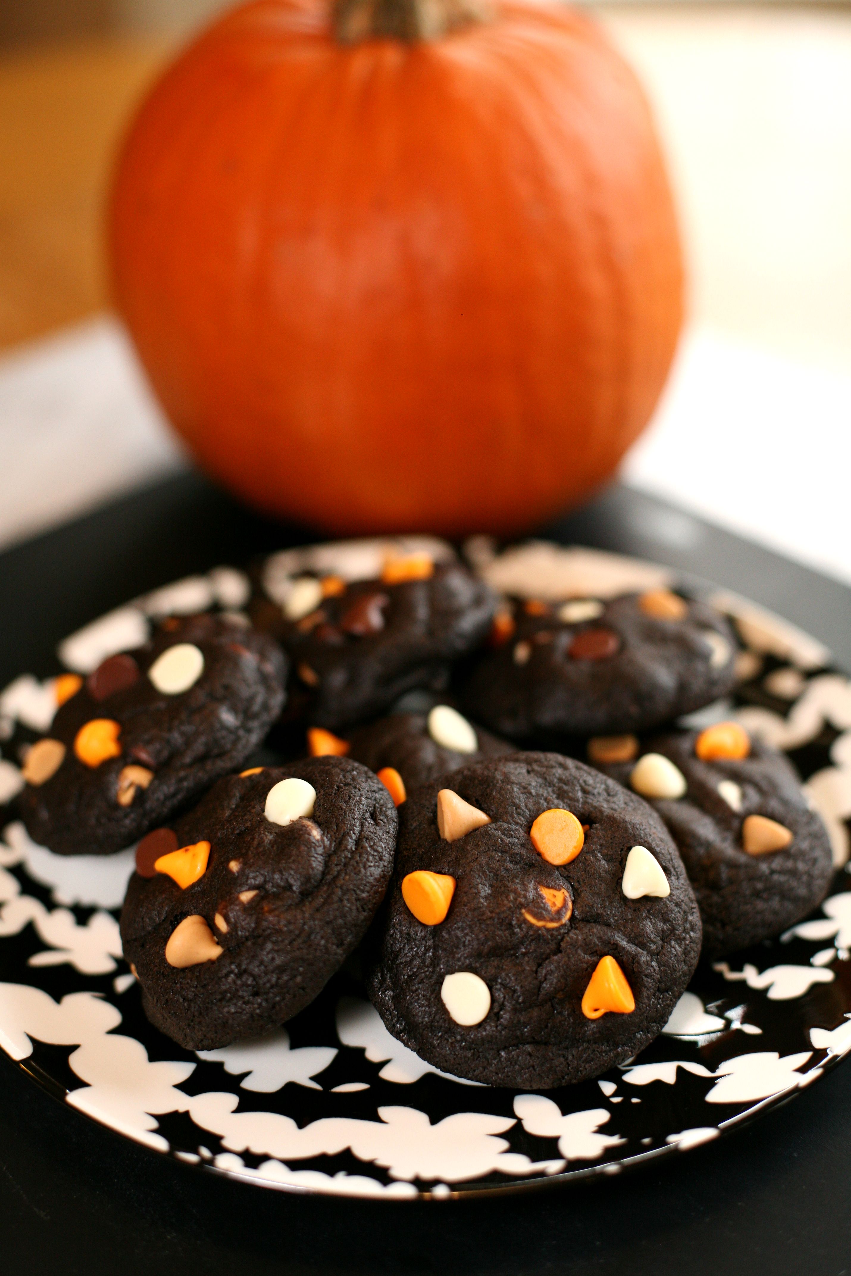 Just before we were about to roll the dough into balls and start the actual baking and cleanup process, friends came over and my helper was off to play! I couldn’t say no, because as much as I love to do things with her I also love the picture of her running in and out of the house laughing with friends and making those special childhood memories. And you know Hailey was promptly back for taste testing, which some may argue as the most important part of the process 🙂 I was thankful for her group of friends tagging along, because I had to hand out some of these cookies that are testing my self discipline by the hour. These Halloween themed cookies are incredibly simple to make and deliciously rich. They also taught me Nestle makes Halloween themed chocolate chips; I don’t recall seeing these in the past, but love the orange chips and the festive feel they give the cookies! The brown (peanut butter) and white (chocolate) chips are a perfect addition to complete the holiday color scheme.