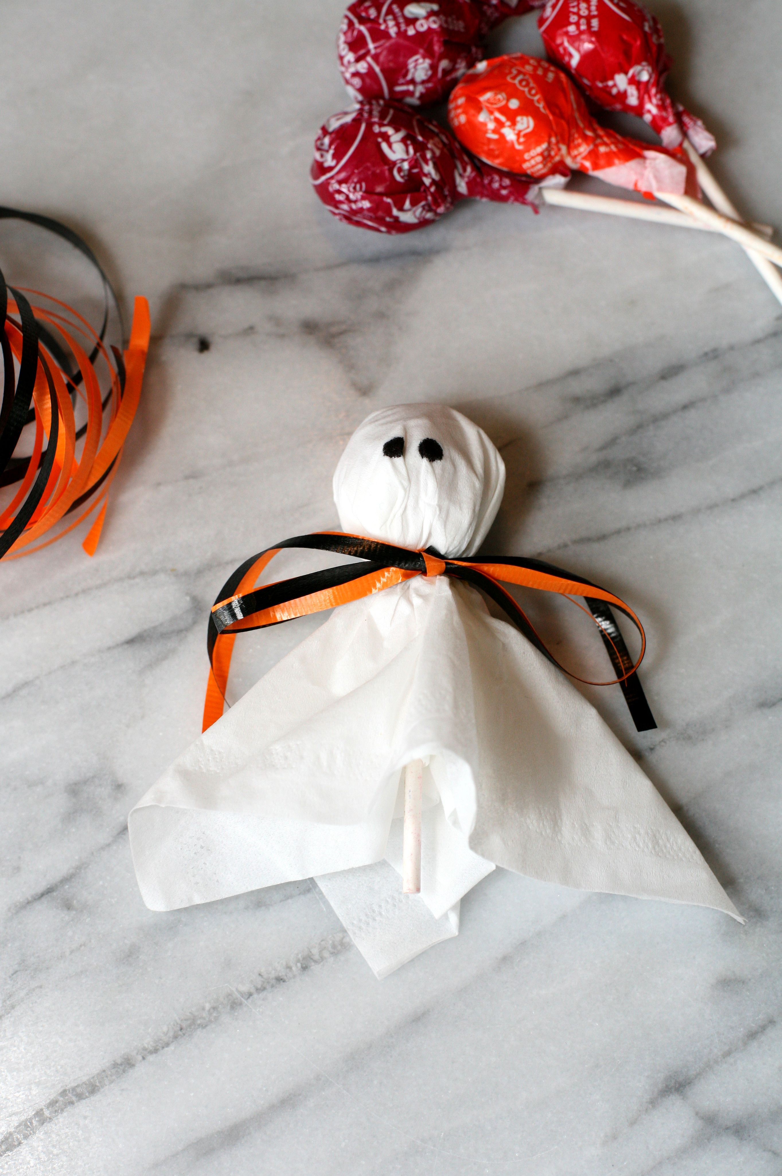 Next you’ll fold the tissue over the lollipop and secure it with one of the mini elastics. To hide the elastic, take one piece of black ribbon and one piece of orange ribbon and tie it around the ‘neck’ into a bow, just like your tying shoes strings. The final touch is two spooky eyes you’ll make with the black sharpie. Since you are writing on tissue the marker will bleed a little so add them by making dots and adding to it if you want them bigger after the color spreads.